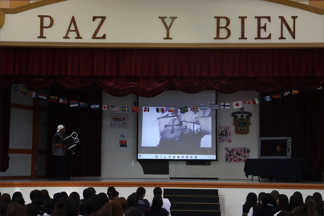 Los alumnos de segundo semestre por grupo acudieron al SUM para formar parte del trabajo preparado por alumnos de la mencionada TAE y por el profesor Lázaro.