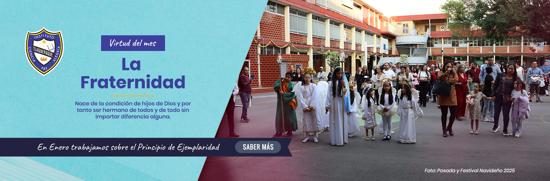 Se realizó el día 15 de diciembre del año en curso con la finalidad de celebrar en la familia del Instituto Tlaquepaque el Nacimiento de Jesús, nuestro Dios y Salvador, mediante el rezo tradicional de la posada y festival navideño, para que el amor a Dios Nuestro Señor crezca en el corazón de todos los que conformamos la comunidad educativa del Instituto Tlaquepaque. El Festival consistió en la puesta en escena de una tradicional pastorela a cargo de la sección primaria y con intervenciones del coro general del Instituto Tlaquepaque con alegres villancicos. Al final las Religiosas Franciscanas de Nuestra Señora del Refugio ofrecieron unos ricos tamales y champurrado. Gracias, Dios les multiplique. Dirección general agradece a todos los que hicieron posible la realización de este evento, esperando que la celebración de la Navidad aumente en todos los que formamos esta gran familia, el amor a Dios hecho hombre, que nos invita y fortalece a vivir en su santa voluntad.